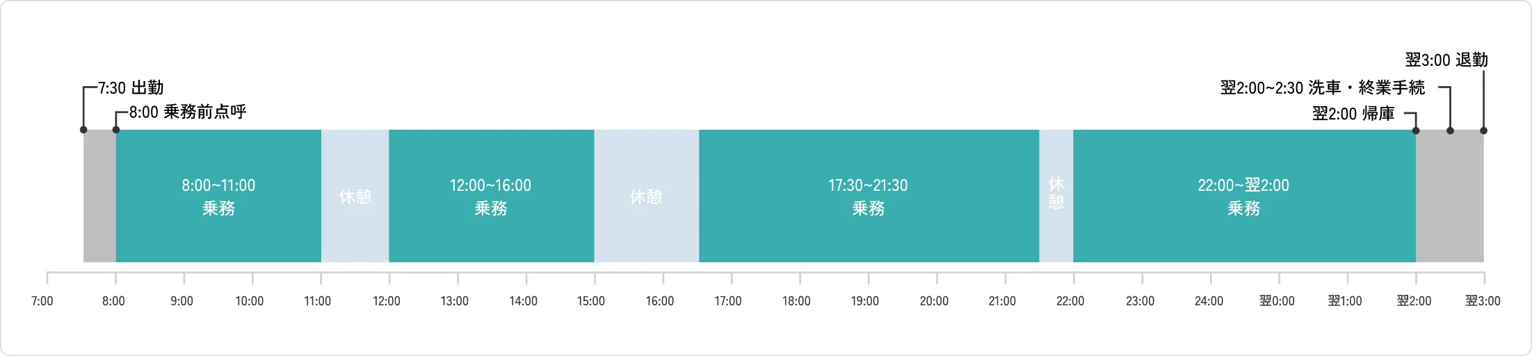 1日のスケジュールは長い乗務時間の中でも適切に休憩を取りながら、安心して働けるようになっています。ご自身のペースを大切にしつつ、安全で安定した乗務を行っていただけます。